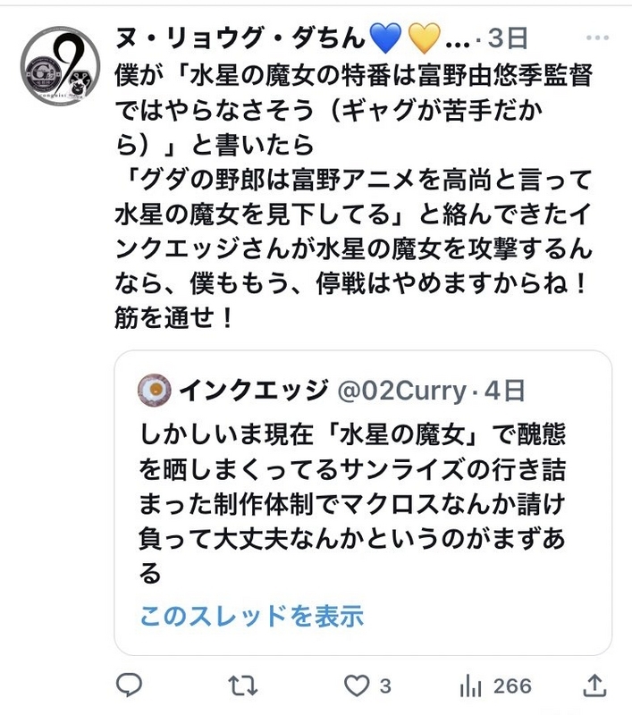 「グダの野郎は富野アニメを高尚と言って水星の魔女を見下してる」と絡んできたインクエッジさんが水星の魔女を攻撃するんなら、僕ももう、停戦はやめますからね!