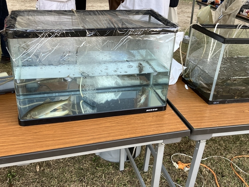 ↑鴨川で今朝取れたアユはイベントの後、スタッフの人の塩焼きのおかずになるそうです。なかなか身が太っていておいしそうですね。火は通せ。